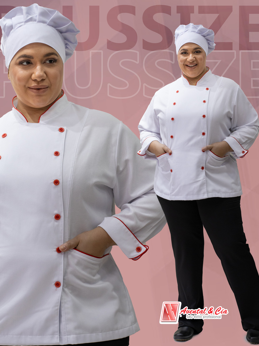 Apresentamos a Dólmã Plus Size Feminina Branca com Vivo Vermelho, a escolha perfeita para chefs que desejam aliar estilo, conforto e profissionalismo na cozinha.